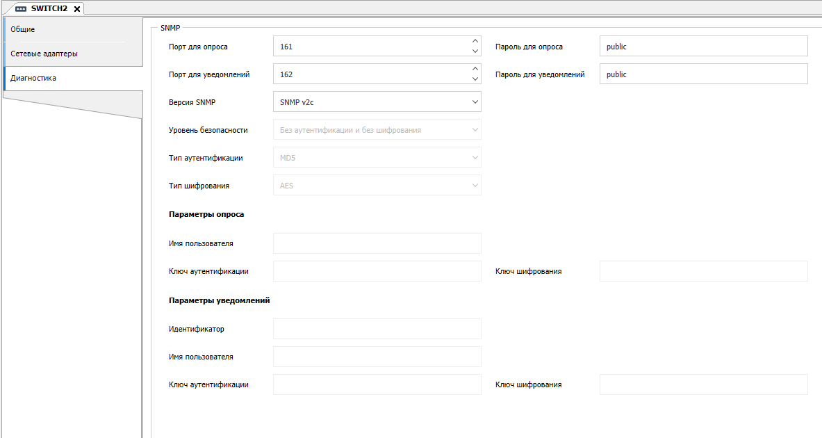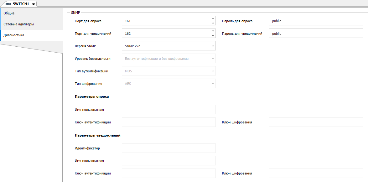 9. Перейдите во вкладку "Диагностика" и установите флаг "SNMP", настройки оставьте по умолчанию.