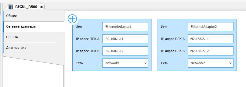 2. Перейдите во вкладку "Сетевые адаптеры", добавьте еще один Ethernet адаптер, нажав кнопку "Добавить", задайте IP адреса для ПЛК А и ПЛК Б из сканера сети. Обратите внимание на название сети.