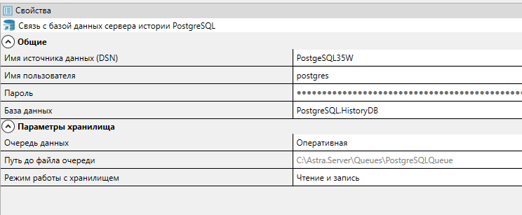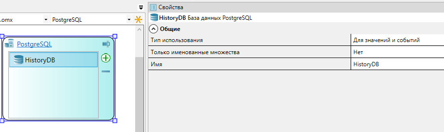 2. В компоненте Astra.Server добавьте модуль в модуле истории и добавьте в него БД PostgreSQL и укажите параметры для связи с ней в свойствах: