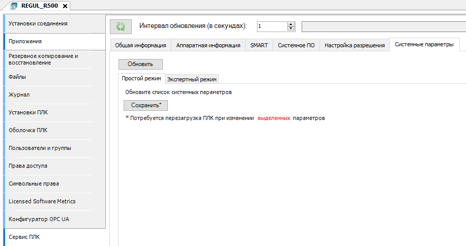 2. Откройте вкладку "Системные параметры" и нажмите кнопку "Обновить".