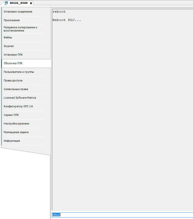 18. Перейдите во вкладку "Оболочка ПЛК". Введите в поле ввода команду "reboot" и нажмите клавишу "Enter". ПЛК будет перезагружен.