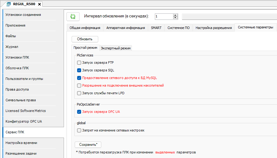 3. На экран будет выведена информация о текущем состоянии доступных параметров. Убедитесь, что флаг "Запуск сервера OPC UA" установлен.
