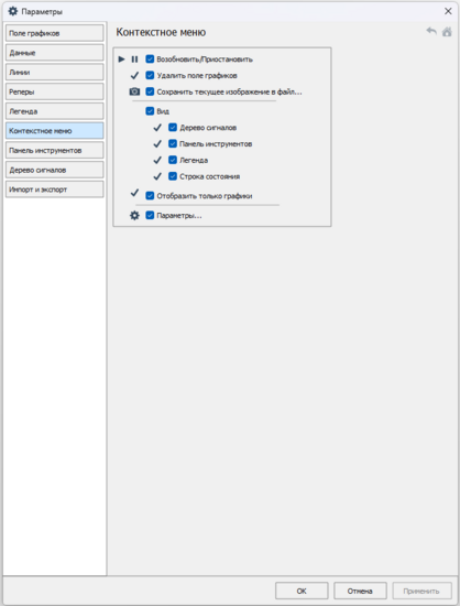 4.5.1.1.2.1.6. Контекстное меню Во вкладке "Контекстное меню" можно настроить состав контекстного меню. Чтобы добавить пункт меню, установите флаг напротив него.