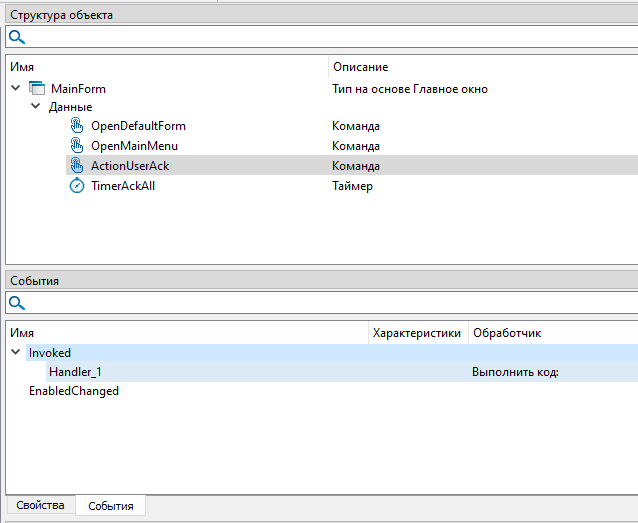 11. Выделите команду ActionUserAck, перейдите на вкладку "События" и добавьте обработчик для события Invoked.