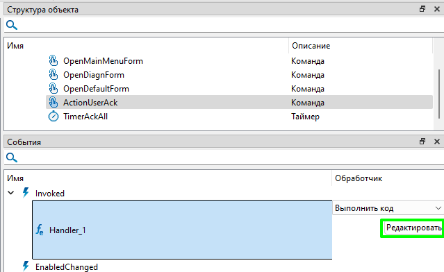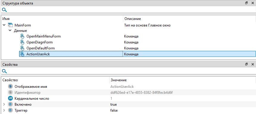 4. В структуре объектов будет добавлена команда. Задайте ей новое имя, например, ActionUserAck.