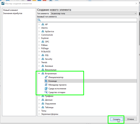 3. В мастере создания элементов выберите из вкладки "Встроенные" тип "Команда" и нажмите кнопку "Создать".