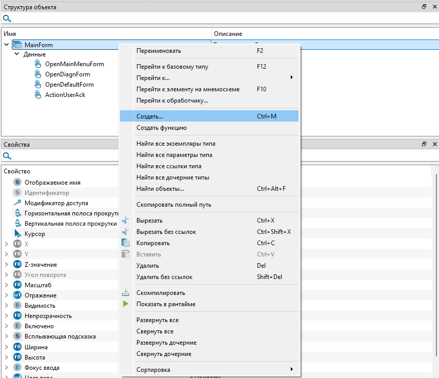 5. Теперь необходимо создать таймер для сброса команды. Вызовите контекстное меню кликнув правой кнопкой мыши по форме в структуре объектов и выберите команду "Создать".