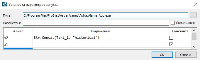 3. В столбце Выражения указываются параметры запуска приложения.