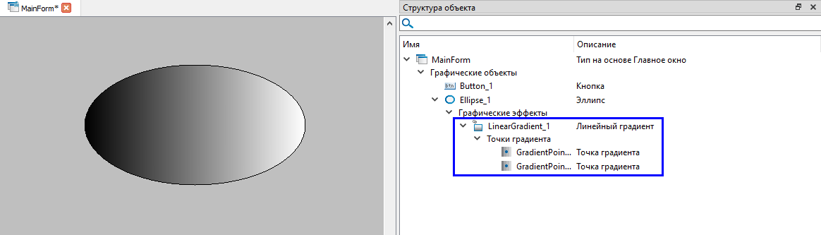 Чтобы выполнить заливку графического объекта в виде плавного линейного перехода между двумя цветами, добавьте компонент Линейный градиент на графический объект. Обычно с помощью градиентной заливки создается объемность в изображении объектов. После применения градиента к графическому объекту создаются точки градиента – первая точка содержит свойства начала градиента, а вторая - свойства конца градиента.