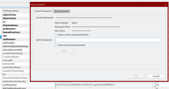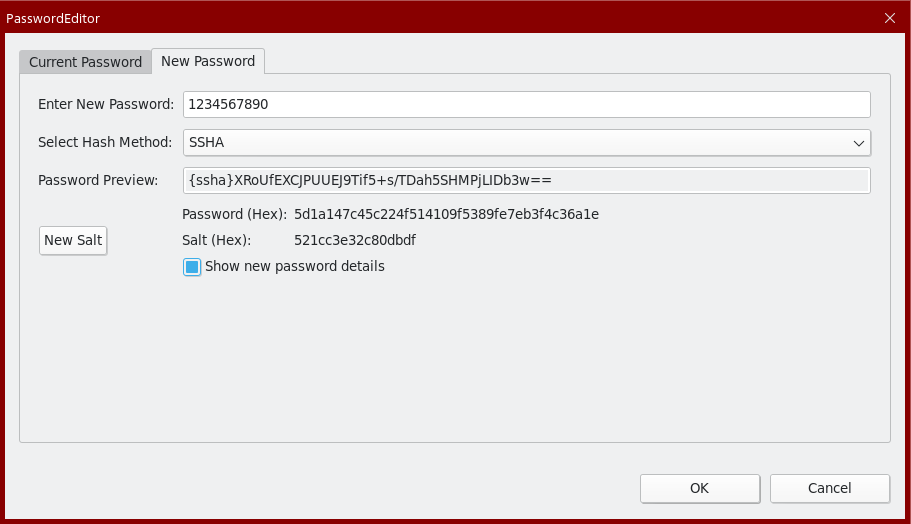 12. Перейдите на вкладку "New Password". Введите новый пароль, укажите метод шифрования "SSHA". Для проверки введенного пароля можете установить флаг "Show new password details". Нажмите кнопку "ОК". Пароль будет успешно изменен.