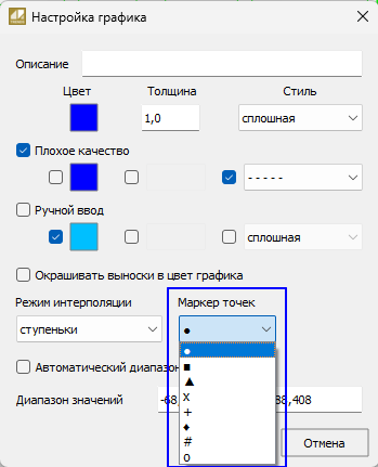 Чтобы изменить маркер точек, вызовите окно Настройки графика двойным щелчком по отображению любого сигнала в легенде и в выпадающем списке выберите маркер точек.