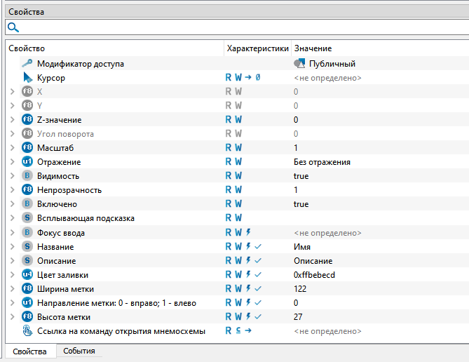 Данный тип предназначен для организации метки перехода между мнемосхемами. При помощи свойств мнемосимвола можно управлять размерами метки, а также задавать пользовательское название и описание метки перехода.