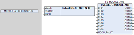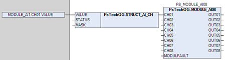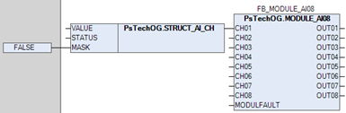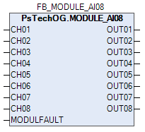 Функциональный блок MODULE_AI08 имеет входные параметры CH01...CH08 для осуществления привязки блока к каналам модуля аналоговых входов AI08 и выходные параметры OUT01...OUT08 для осуществления привязки блока к измерительным входам блоков обработки аналоговых данных (PVI, M_PID и т.д.).