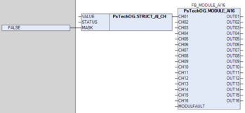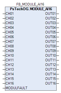 Функциональный блок MODULE_AI16 имеет входные параметры CH01...CH16 для осуществления привязки блока к каналам модуля аналоговых входов AI16 и выходные параметры OUT01...OUT16 для осуществления привязки блока к измерительным входам блоков обработки аналоговых данных (PVI, M_PID и т.д.).