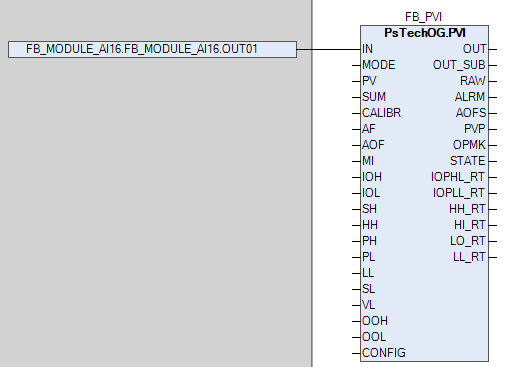 Привязка обработанного канала X (параметр OUTX) блока MODULE_AI16 к измерительному входу блока обработки аналоговых данных (PVI, M_PID и т.д.) происходит напрямую в виде точка-точка. На рисунке ниже показан пример привязки: