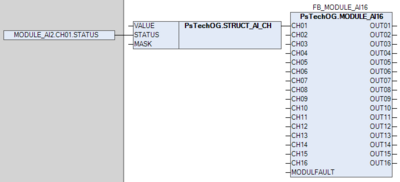 Функциональный блок MODULE_AI16 используется в качестве промежуточного звена между каналами модуля аналоговых входов AI16 и измерительными входами блоков обработки аналоговых данных (PVI, M_PID и т.д.).