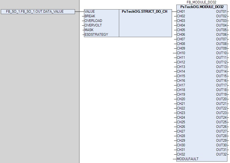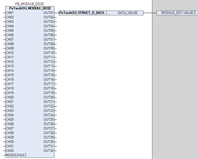 Функциональный блок MODULE_DO32 используется в качестве промежуточного звена между выходами блоков дискретного управления (SO_1, MC_2E и т.д.) и каналами модуля дискретных выходов DO32.