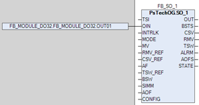 Параметр OUTX привязывается к соответствующему входу сигнала слежения OIN блока дискретного управления (SO_1, MC_2E и т.д.) напрямую в виде точка-точка. С помощью этой схемы блоком дискретного управления (SO_1, MC_2E и т.д.) осуществляется отслеживание работы и состояния модуля дискретных выходов, а именно в случае его неисправности блок дискретного управления (SO_1, MC_2E и т.д.) сформирует аварию OOP c переходом в режим IMAN и слежением значения управляемой переменной (обратное преобразование параметра MV) за значением стратегии ПАЗ (предустановленное значение в случае неиcправности). На рисунке ниже показан пример привязки: