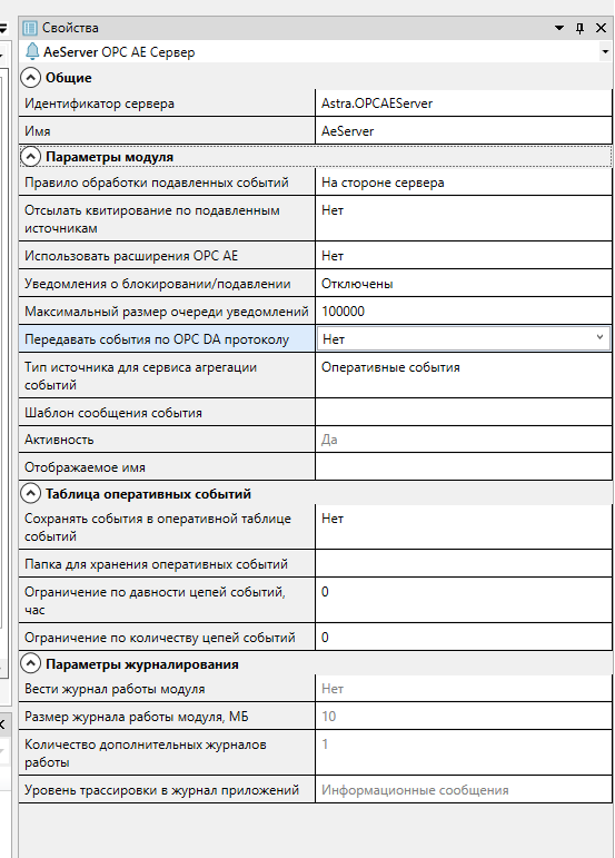 Перейдите в исполняющий компонент Astra.AccessPoint и выделите модуль AeServer. Во вкладке свойства отобразится таблица с описанием свойств модуля.