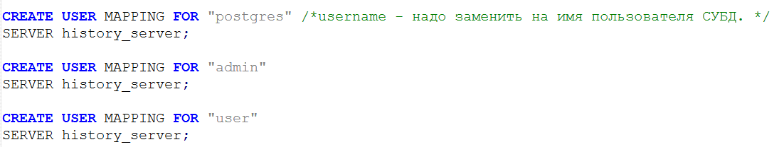 2. Если пользователей СУБД несколько, то пропишите команды SQL CREATE USER MAPPING для каждого пользователя в конце файла:CREATE USER MAPPING FOR "postgres"SERVER history_server;CREATE USER MAPPING FOR "admin"SERVER history_server;CREATE USER MAPPING FOR "user"SERVER history_server;