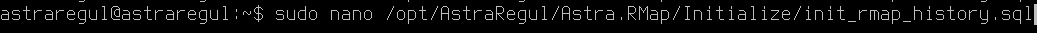 Откройте для редактирования файл скрипта init_rmap_history.sql, расположенный в каталоге установки Astra.RMap, выполнив команду:sudo nano /opt/AstraRegul/Astra.RMap/Initialize/init_rmap_history.sql