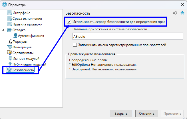 Настройка безопасности позволяет ограничить права пользователей при работе в Astra.AStudio: