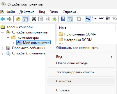 В открывшемся окне выберите Корень консоли → Службы компонентов → Компьютеры → Мой компьютер.В контекстном меню компонента "Мой компьютер" выберите пункт "Свойства".