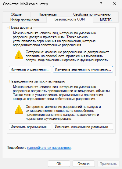 Выберите вкладку "Безопасность COM". В группе "Права доступа" нажмите кнопку "Изменить ограничения".