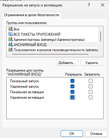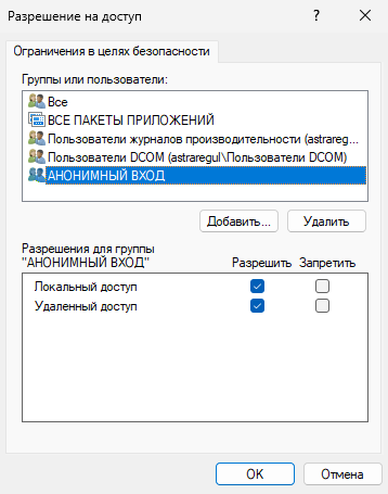 7. В отрывшемся окне добавьте группы "Все" и "АНОНИМНЫЙ ВХОД".