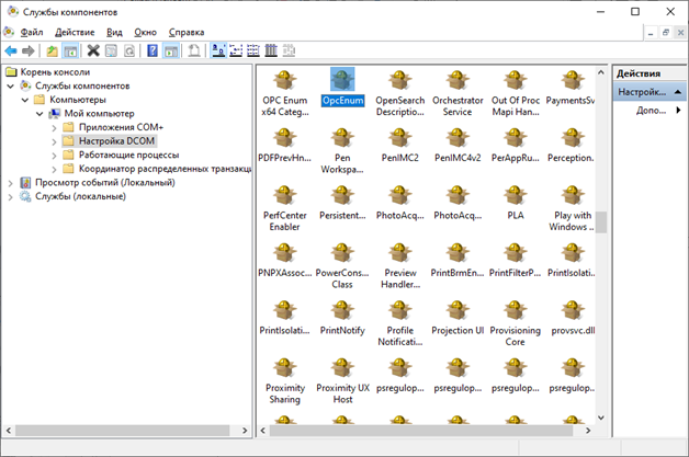 В окне "Службы компонентов" выберите пункт "Настройка DCOM" и в отрывшемся списке выберите компонент OpcEnum. В контекстном меню компонента "OpcEnum" выберите пункт "Свойства".