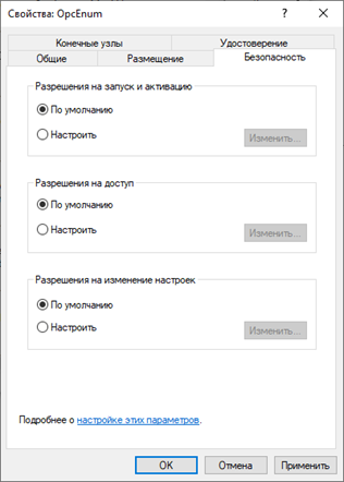 9. Далее необходимо настроить параметры DCOM для утилиты поиска OPC-серверов OpcEnum.