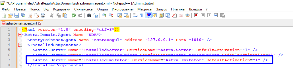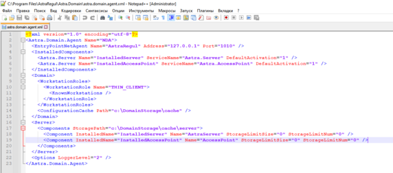 1. Откройте файл astra.domain.agent.xml при помощи редактора Notepad++.