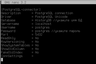 3. Создайте подключение к базе данных. Откройте файл odbc.ini с помощью команды :