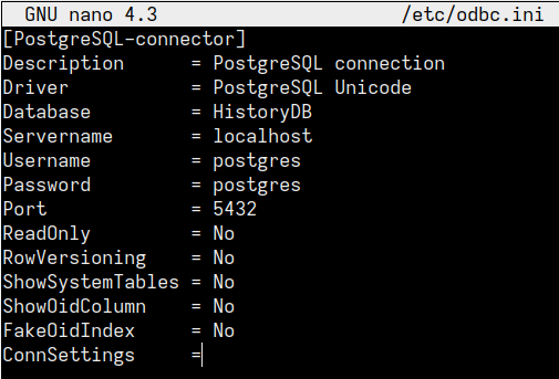 3. Создайте подключение к базе данных. Откройте файл odbc.ini с помощью команды :