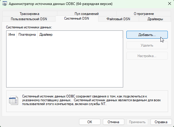 2. В окне "Администратор источников данных ODBC" перейдите на вкладку "Системный DSN" и нажмите кнопку "Добавить...".