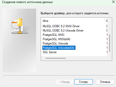 В появившемся окне Создание нового источника данных выберите драйвер «PostgreSQL Unicode(x64)» и нажмите кнопку "Готово".