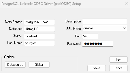 3. В окне "PostgreSQL Unicode ODBC Driver (psqlODBC) Setup" укажите параметры источника: