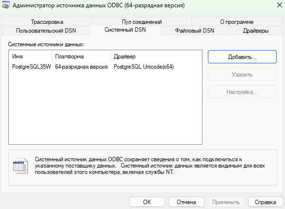 Для настройки драйвера ODBC для PostgreSQL выполните следующие действия: