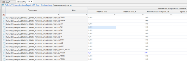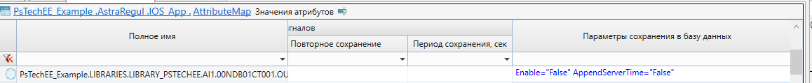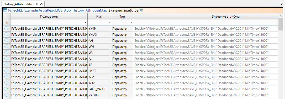6. Откройте добавленную карту атрибутов кликнув по названию карты. В открывшемся окне будут добавлены все параметры для всех экземпляров функциональных блоков в проекте, для которых доступно изменение настроек сохранения в историю.