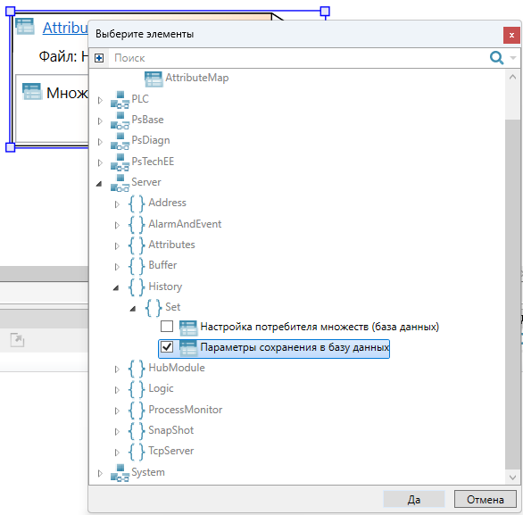 4. Укажите путь к атрибуту "Множество исторических сигналов", отвечающему за сохранение параметров в историю и нажмите "Да".