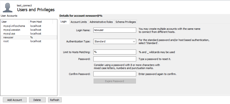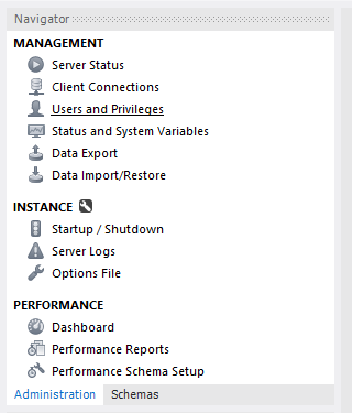 1. В навигаторе перейдите на вкладку "Administration" и выберите "User and Privileges".