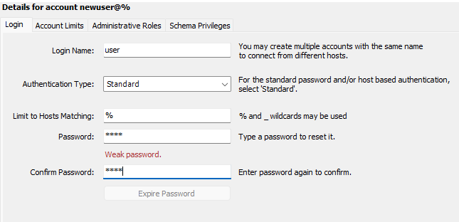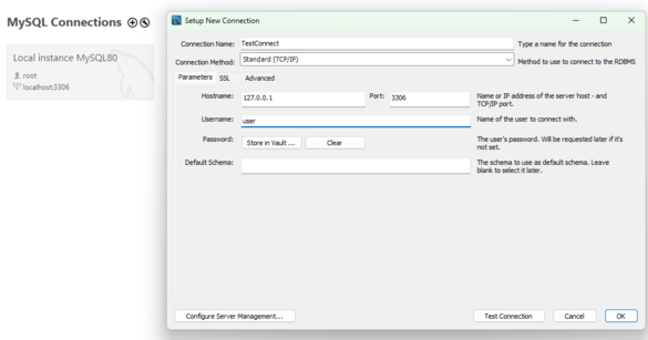8. На вкладке добавления подключений проверьте подключение пользователя "user" к БД. Нажмите на "+" в области "MySQL Connections". Откроется новое окно. Введите имя подключения и имя пользователя.