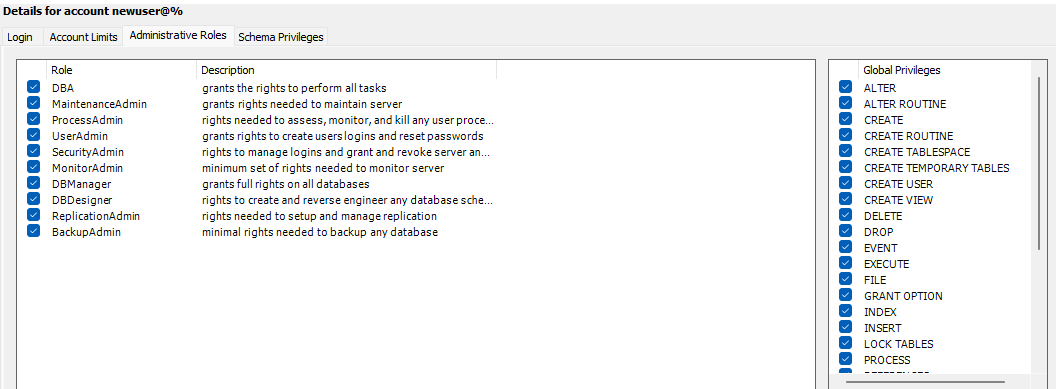 4. Во вкладке "Administrative Roles" отметьте "DBA" и нажмите "Apply".