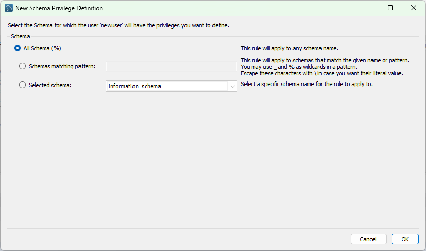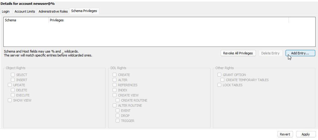 5. Перейдите на вкладку "Schema Privileges" и нажмите "Add Entry".