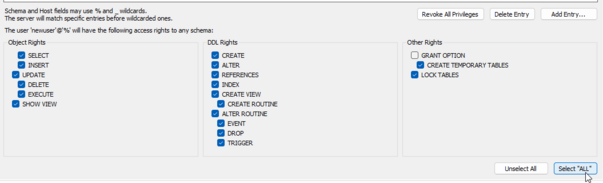 7. Нажмите на кнопку "Select "ALL" для предоставления всех привилегий пользователю и нажмите "Apply".