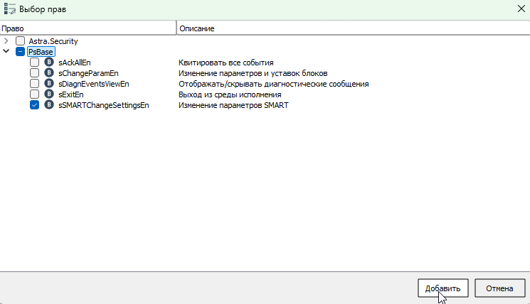 5. Выберите логическое право "sSMARTChangeSettingsEn" из приложения "PsBase" и нажмите кнопку "Добавить".