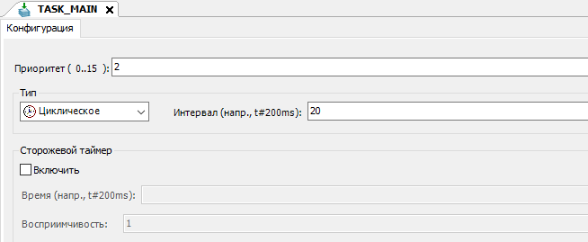 8. Откройте задачу "TASK_MAIN" двойным кликом левой кнопки мыши. Задача имеет следующие параметры: приоритет – 2, тип исполнения – "Циклическое" и интервал – 20 мс.