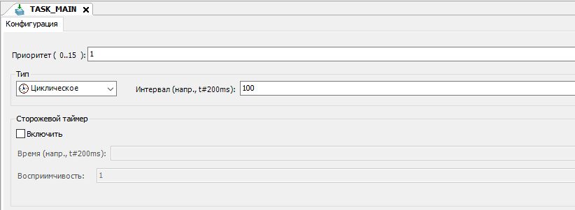 В конфигурации задачи задайте приоритет – 1 и интервал – 100 мс.