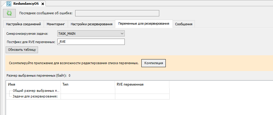 9. Перейдите в компоненте "RedundancyOS" во вкладку "Переменные для резервирования" и выберите в выпадающем списке синхронизируемую задачу "TASK_MAIN", нажмите кнопку "Компиляция".