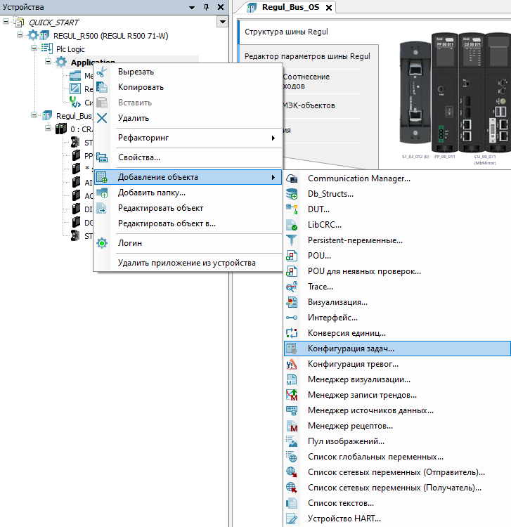 5. Добавьте в проект объект "Конфигурация задач". Для этого в контекстном меню приложения "Application" выберите "Добавление объекта" → "Конфигурация задач...".